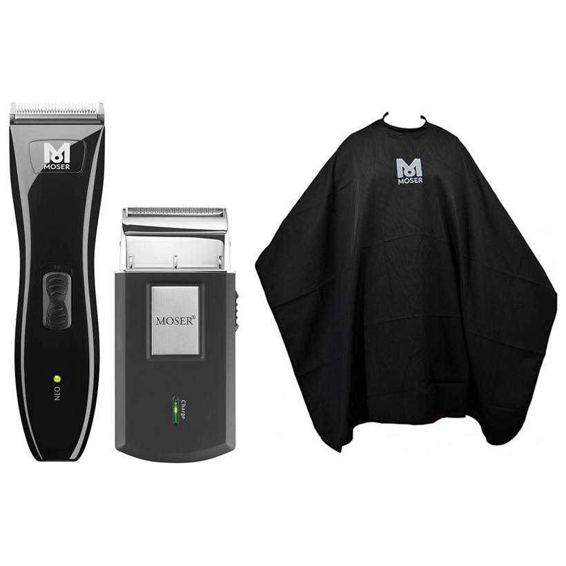 Набор от бренда Moser включает машинку Neo Clipper для стрижки волос, которая обеспечивает точные и чистые результаты, шейвер для бритья Mobile Shaver, а также стильный черный пеньюар для защиты одежды в процессе работы.