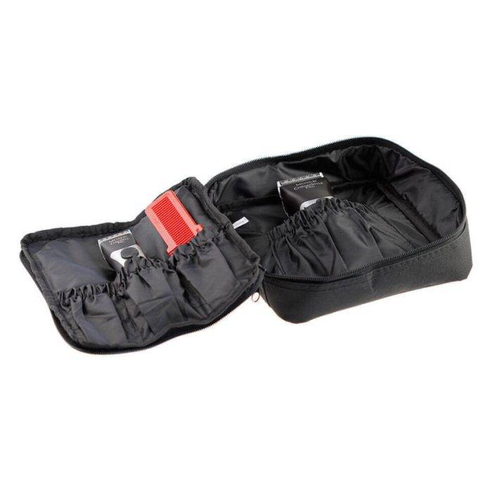 Вместительная сумка-чехол Moser Universal Clipper Pouch рекомендована для парикмахеров. Чехол помогает безопасно хранить или перевозить машинки для стрижки и триммеры окантовки волос. На верхнем клапане сумки расположены 3 маленькие кармана на резинке, 1 карман на нижнем и основное отделение. На лицевой стороне чехла вышит красный логотип Moser®. Двусторонняя застежка сумочки открывается и закрывается с любой стороны, а значит, одинаково удобна для правшей и левшей. В пенал помещаются: машинка для стрижки волос, триммер, адаптеры для зарядки, насадки, масло и кисточка для чистки ножей.