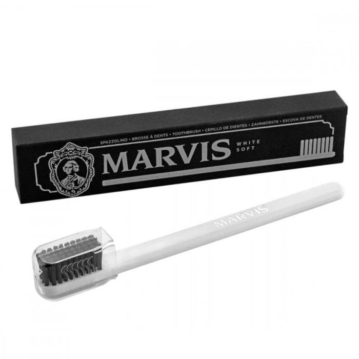 Оригинальная двухцветная зубная щетка Marvis White с белым корпусом и антрацитовой щетиной. Не травмирует десны. Подходит людям с чувствительной эмалью и деснами. Щетина выполнена из мягкого нейлона, легко справляется с налетом. Щетка легкая и прочная. Укомплектована колпачком для удобства хранения и транспортировки.